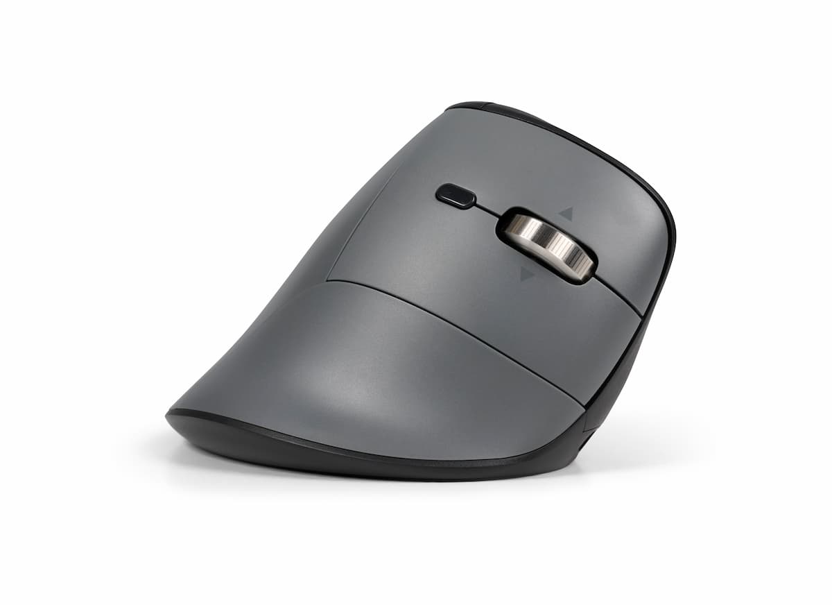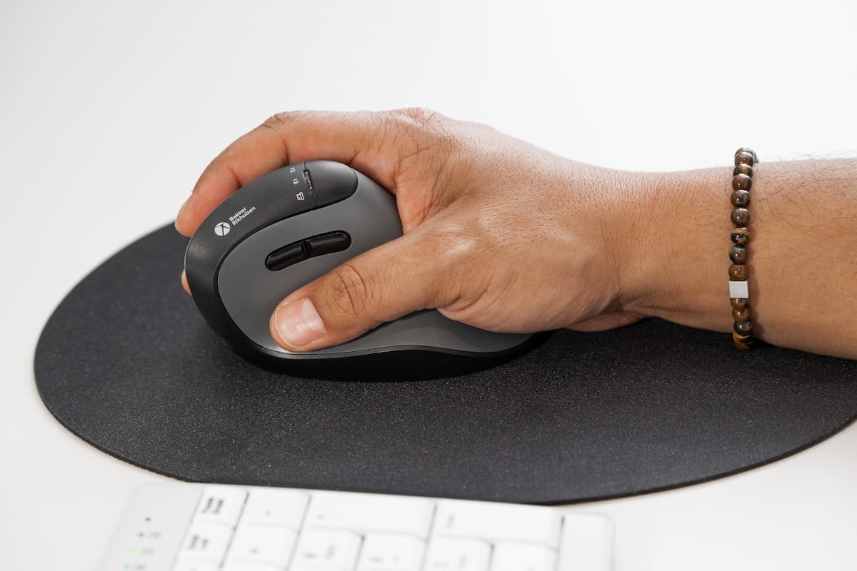 De FastForward is ontworpen met een hellingshoek van 75°, waardoor je hand automatisch in een natuurlijke, ontspannen positie ligt. Dit voorkomt spanning in je hand, pols en onderarm, ondersteunt een betere houding en helpt veelvoorkomende klachten zoals RSI en het carpaletunnelsyndroom voorkomen. Het voelt zo natuurlijk als iemand een hand geven (maar dan zonder ongemakkelijk oogcontact). Hierdoor hoef je niet lang te wennen aan een ergonomische houding. Deze ergonomische voordelen zijn onderbouwd door onderzoek, waarin een verticale handpositie verband houdt met minder spierspanning (Aarås et al., 2001; Quemelo & Vieira, 2013). Je pols blijft recht en de klikbeweging wordt lichter waardoor je vingers minder kracht hoeven te zetten.